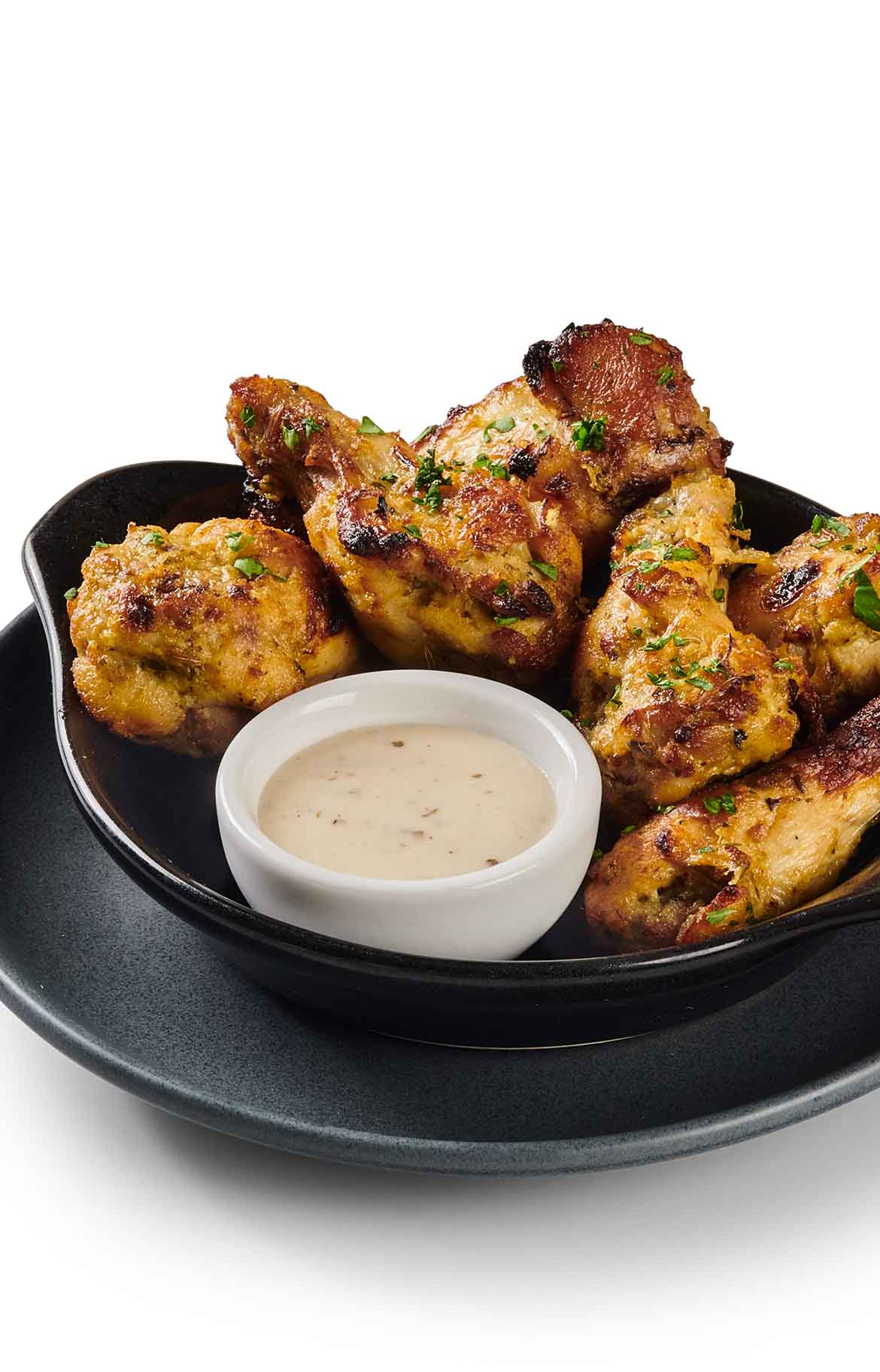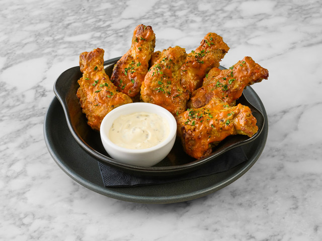 Flavour-packed chicken wings, smothered in spicy buffalo sauce, and sprinkled with parsley. Served with a classic cool blue cheese dip. A little bit messy but so worth it
