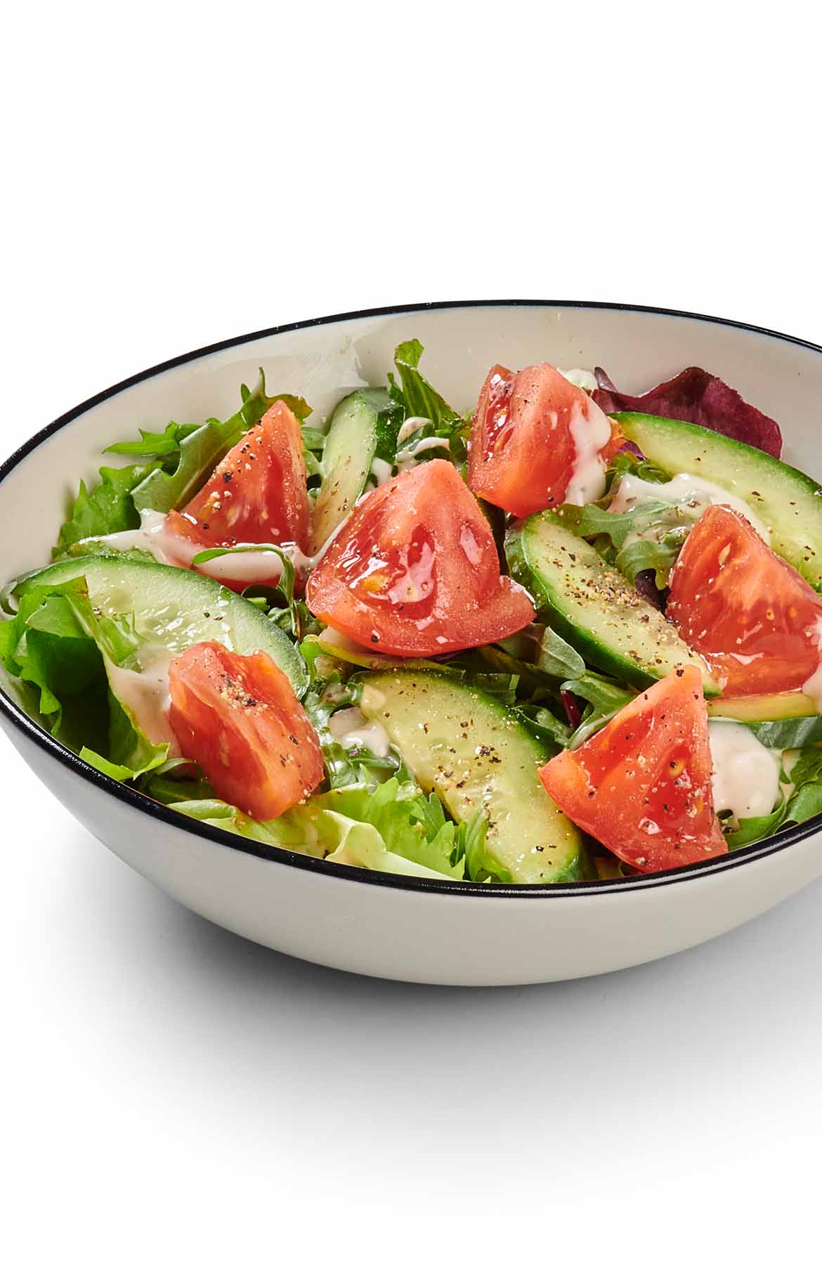 Baby spinach, rocket, seasonal tomatoes and cucumber with our house dressing