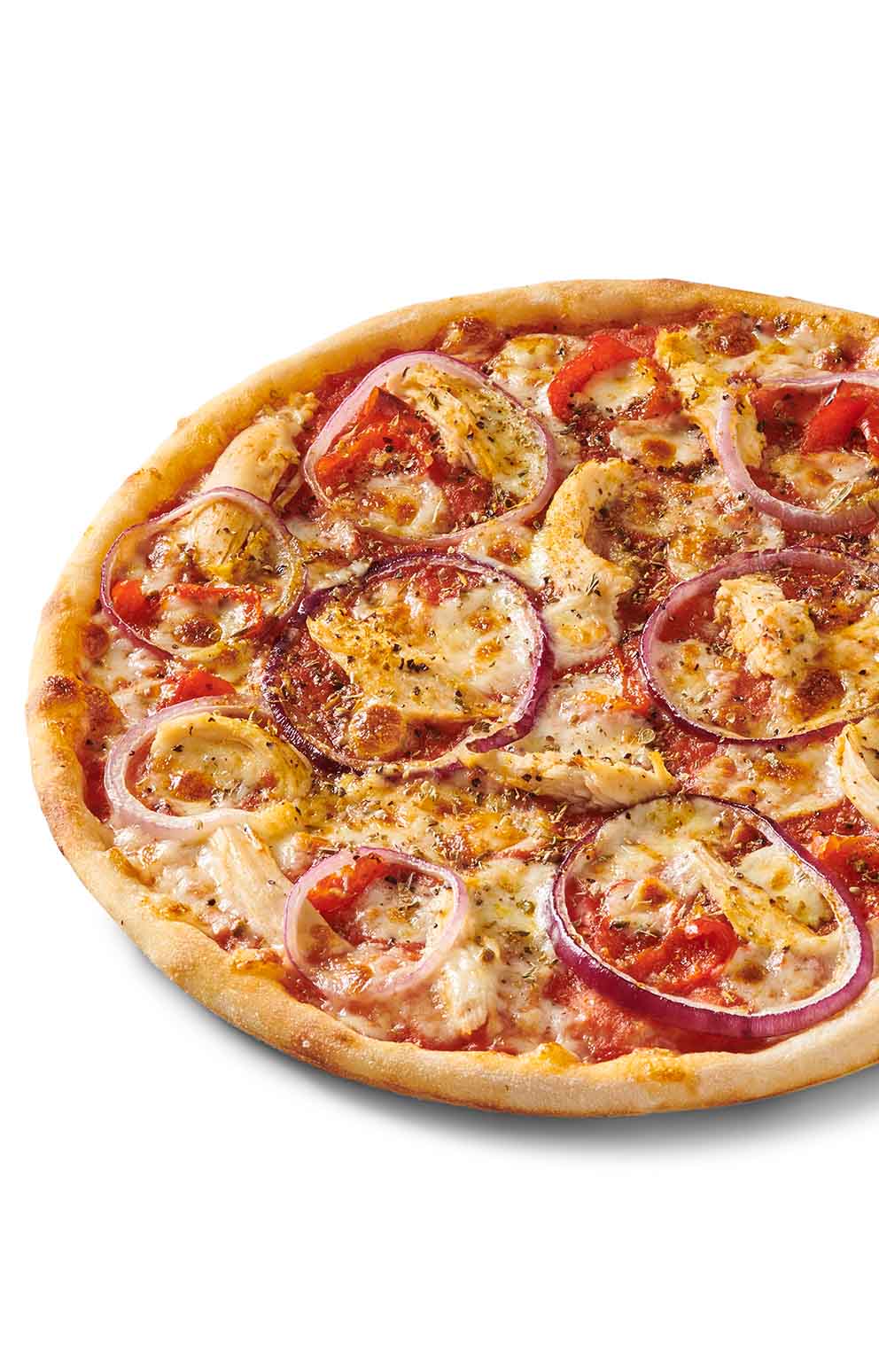 A sweet and smoky sensation. BBQ chicken, mozzarella, roasted peppers and red onion on a BBQ sauce base and sprinkled with parsley.