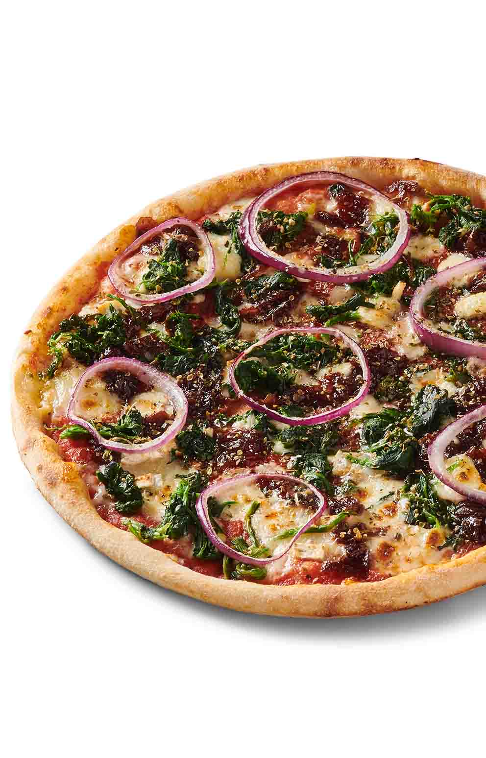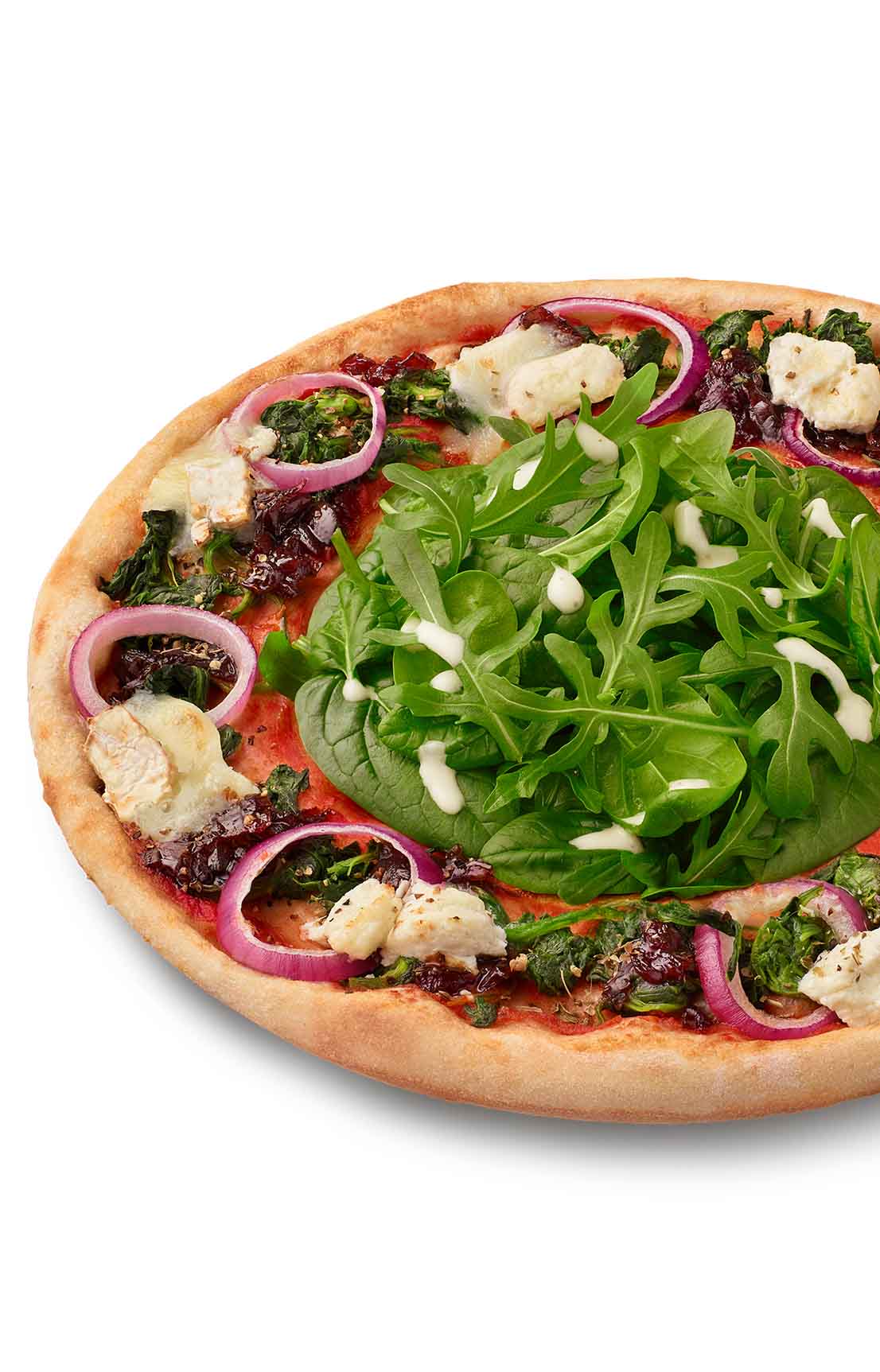 Goat's cheese, sweet caramelised onions and spinach combine with mozarella, tomato, garlic oil and red onions in a feast of great tastes and textures