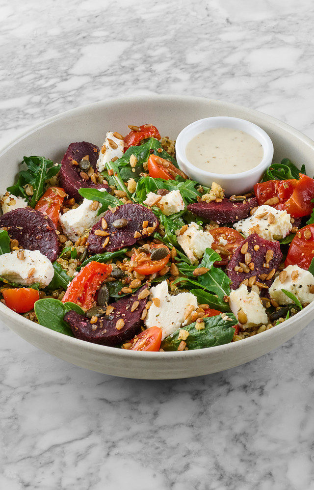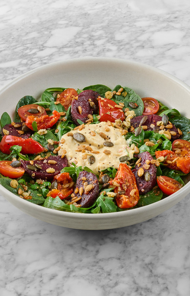 Delicious mixed grains, slow-roasted tomatoes and fresh baby tomatoes, with spinach, rocket and spiced toasted seeds With balsamic roasted beetroot, garlic Tenderstem broccoli and houmous