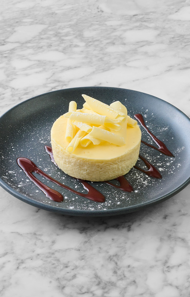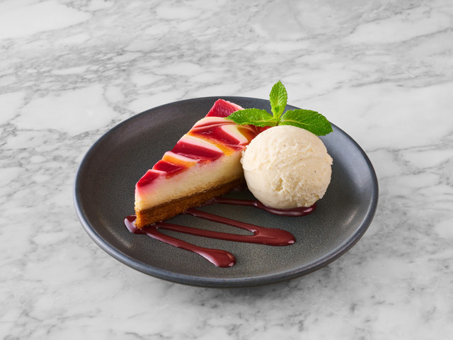 A zesty lemon cheesecake, topped with a raspberry and lemon swirl on a caramelised biscuit base. Served with raspberry coulis and vanilla gelato