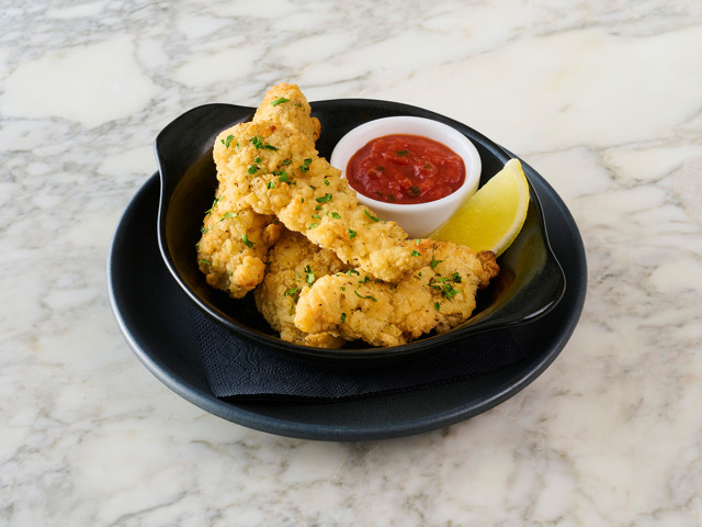 Lightly crumbed tender squid rings with Caesar dressing, lemon and parsley