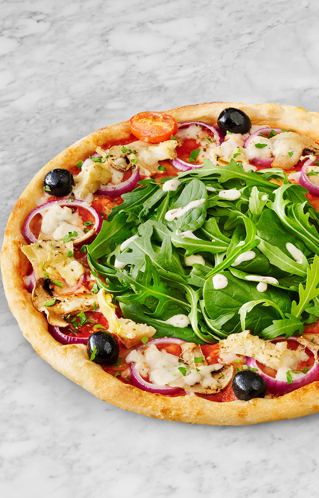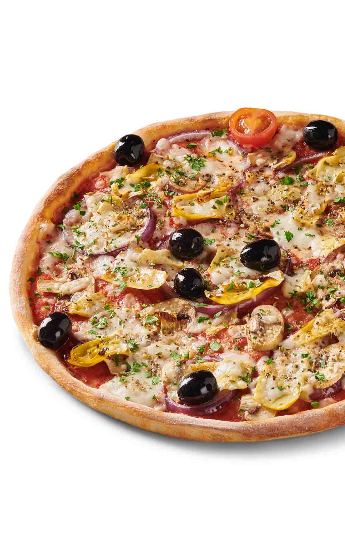 Artichoke, mushroom, red onion, and black olives, with vegan mozzarella alternative and parsley