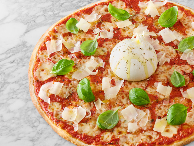 All hail the queen. A whole creamy burrata sitting atop a tomato with garlic and mozzarella base. With fresh basil, Gran Milano cheese and extra virgin olive oil