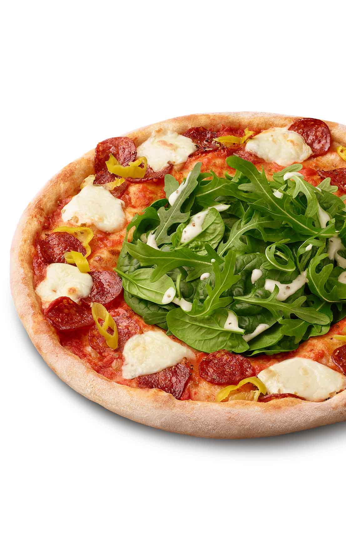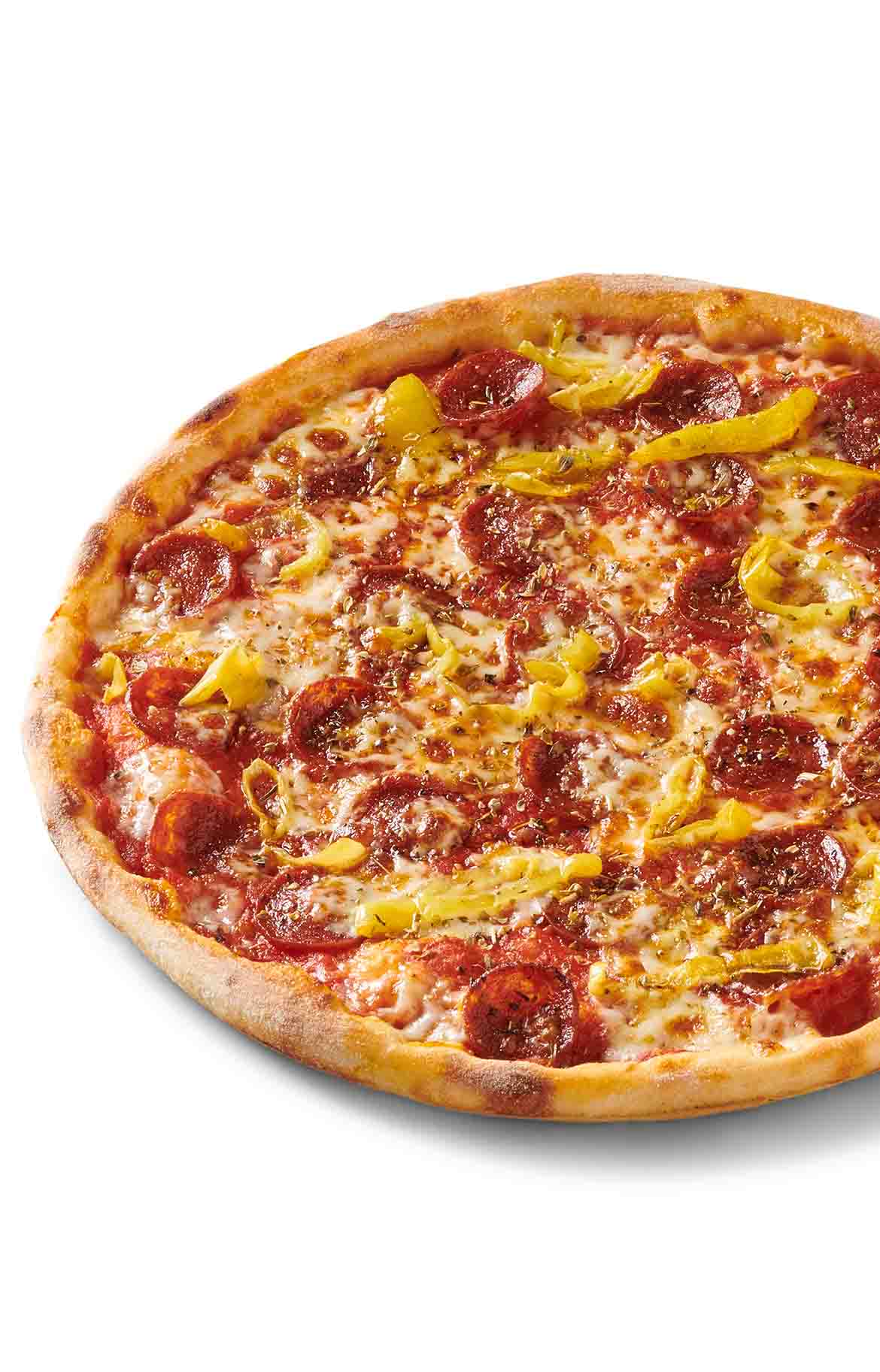 We're proud of our pepperoni - it's packed with paprika for a deep, smoky flavour. Here it's teamed up with mozzarella, tomato and a choice of hot green or jalapeno peppers