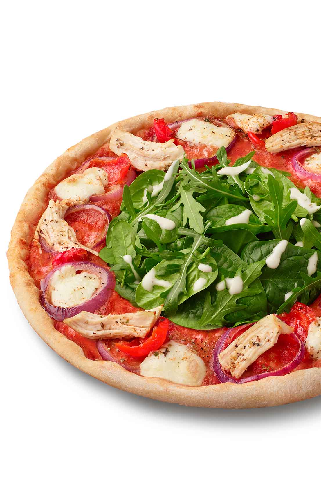 A mouthwatering combination. Pancetta, chicken, melting mozzarella, tomato, garlic and finished with parsley and Gran Milano cheese