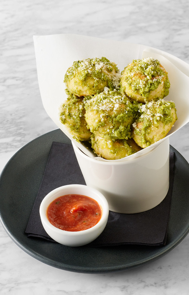 Freshly baked Dough Balls, tossed in delicious green basil & pine kernel pesto, with an Italian tomato dip and Gran Milano cheese - the colours of the Italian flag