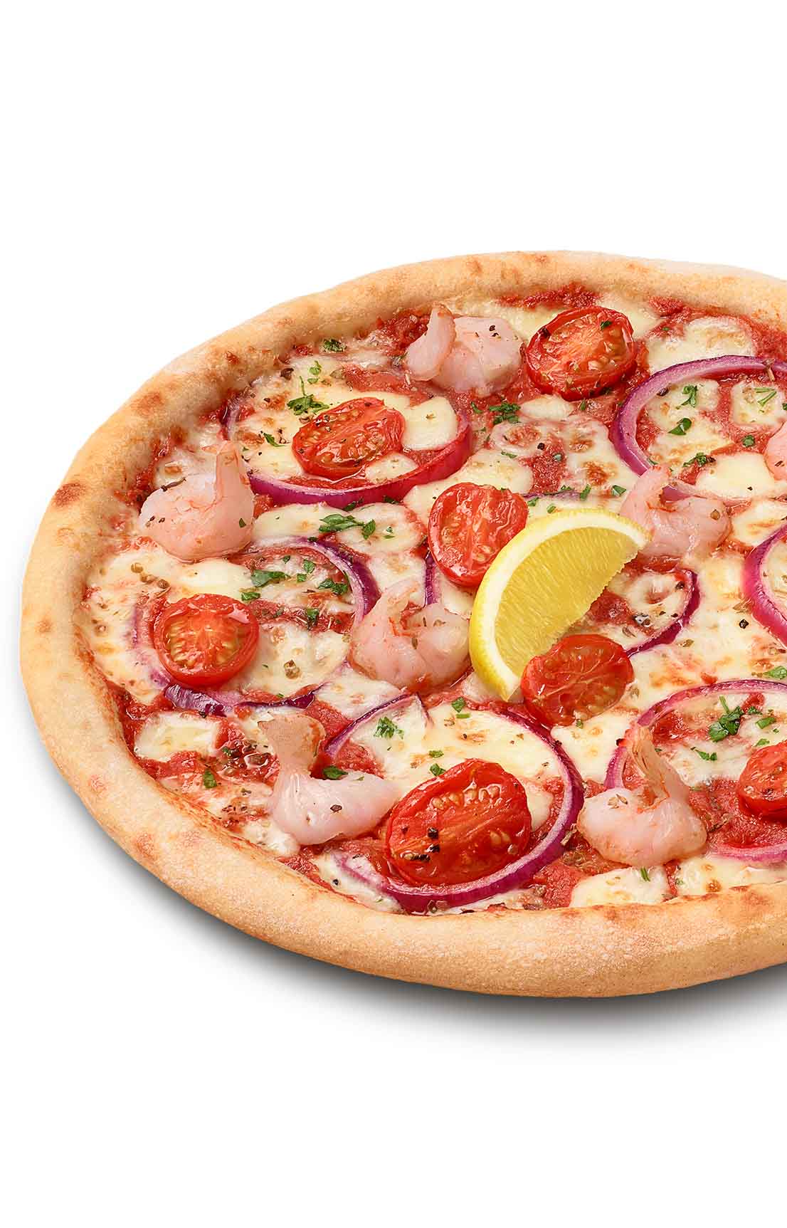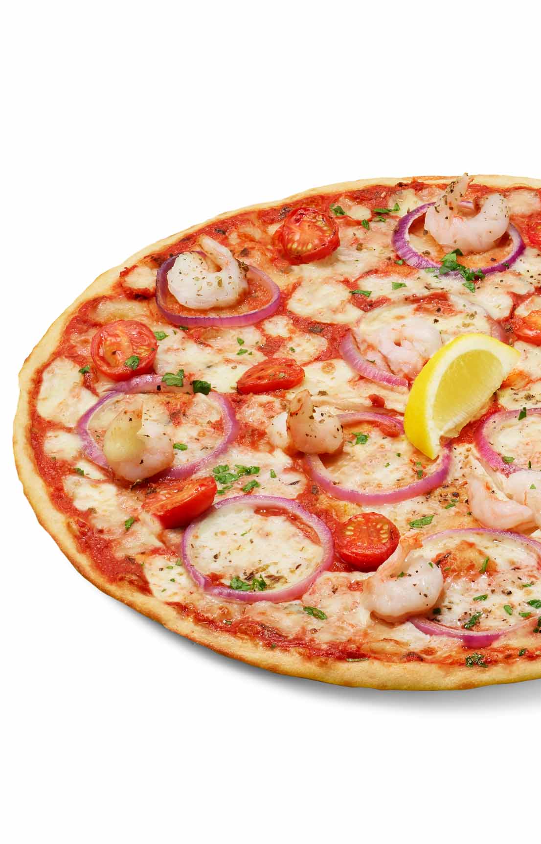 Butterflied garlic king prawns on an Italian tomato base, with mozzarella, red onion and baby plum tomatoes. Finished with fresh parsley and a squeeze of lemon