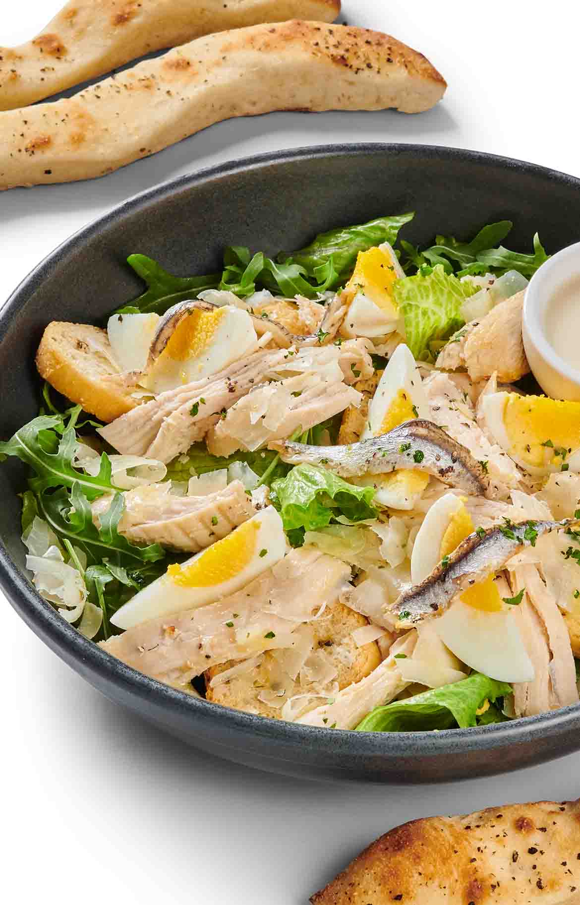 Chicken, brown anchovies, Cos lettuce, croutons, Gran Milano cheese, free-range egg and Caesar dressing