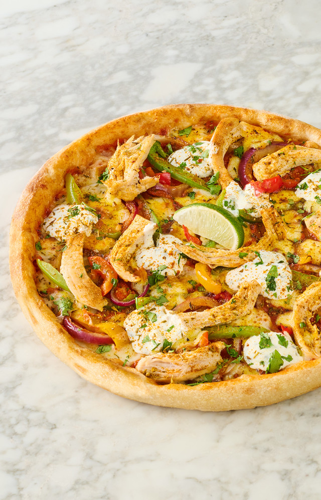 Fajita spiced chicken, roasted peppers, garlic, red onion, tomato and mozzarella, finished with fresh coriander, sour cream and lime