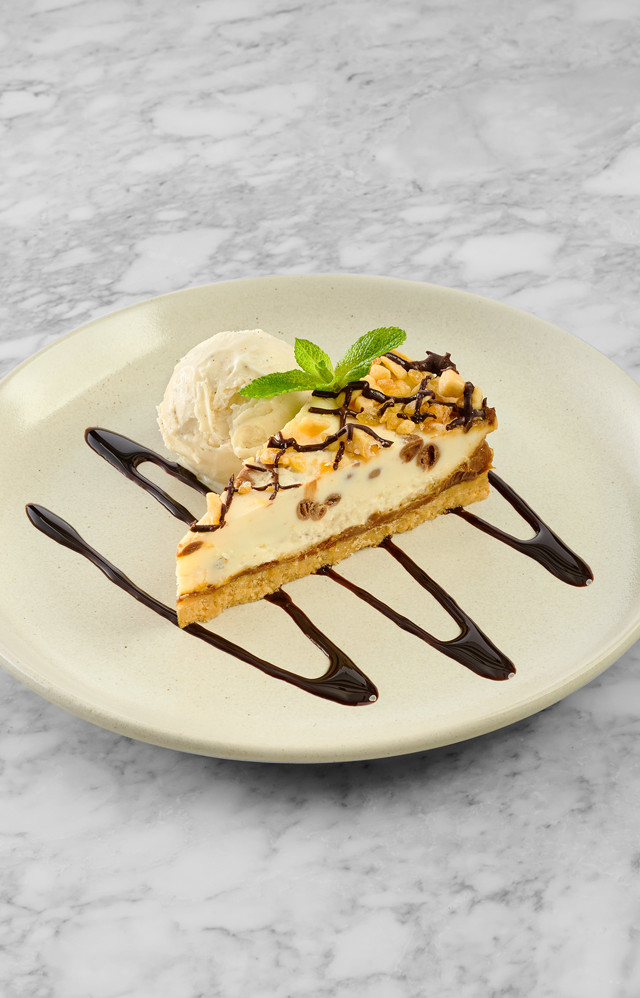 Honeycomb, chocolate, whipped cream, and salted caramel on a deliciously rich biscuit base with chocolate sauce. Served with your choice of cream, gelato or mascarpone
