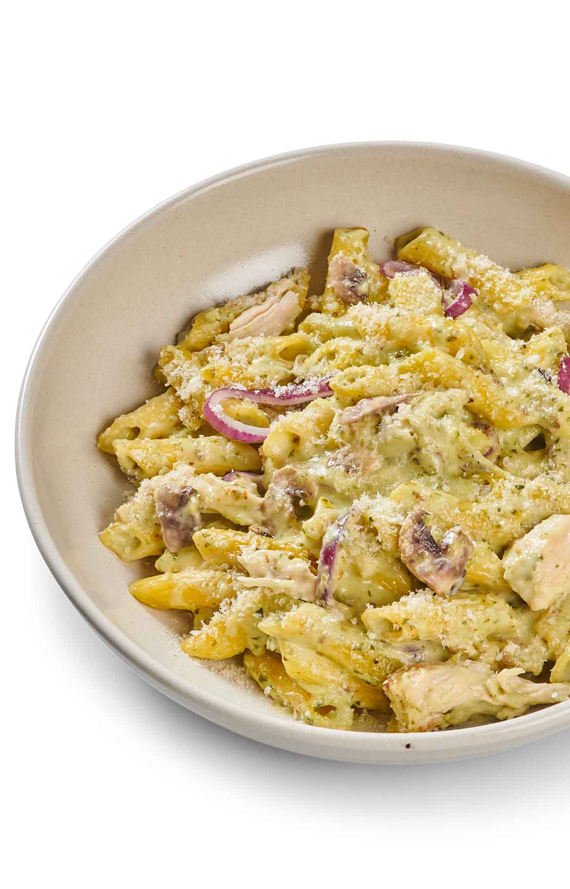 NEW RECIPE Chicken, penne, mushrooms, red onions, mozzarella and Gran Milano cheese with penne, bechamel and basil & pine kernel pesto