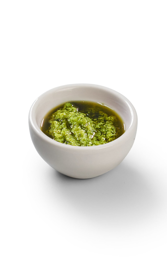 Double helpings with garlic butter, basil & pine kernel pesto and smoky tomato harissa