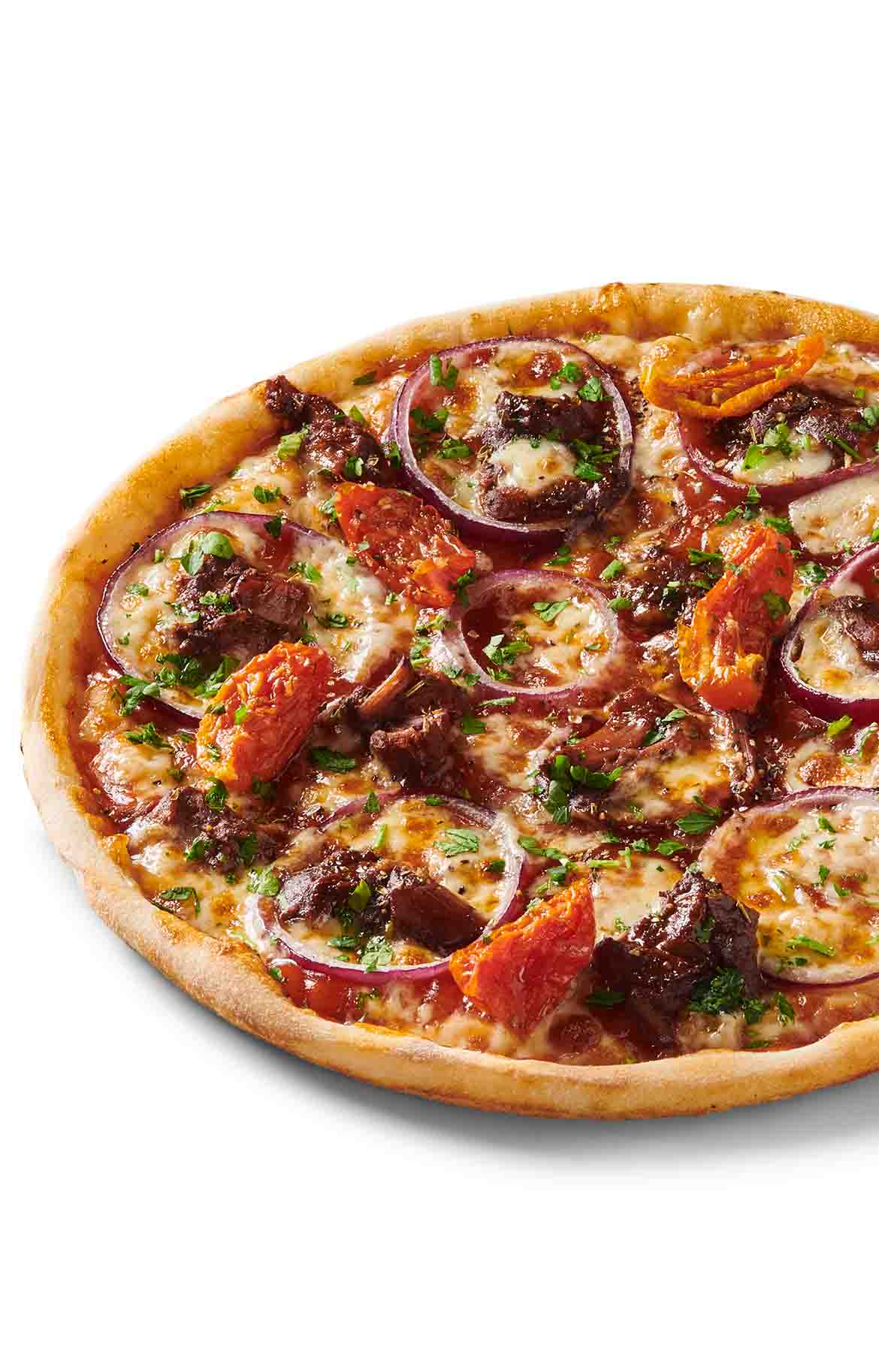Slow-cooked beef brisket with a hint of chipotle, sweet & smoky BBQ sauce, mozzarella and red onions, topped with roasted tomatoes and parsley