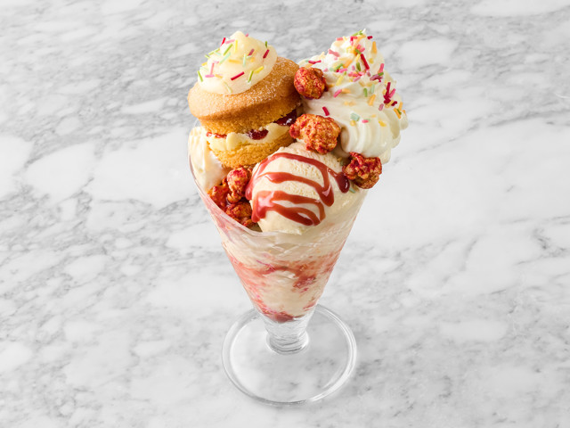 A party in a glass. Vanilla gelato, raspberry coulis, whipped cream and colourful sprinkles, adorned with a vanilla sponge cake filled with buttercream and raspberry jam, all topped with birthday cake popcorn, handmade by our friends at Joe & Seph's