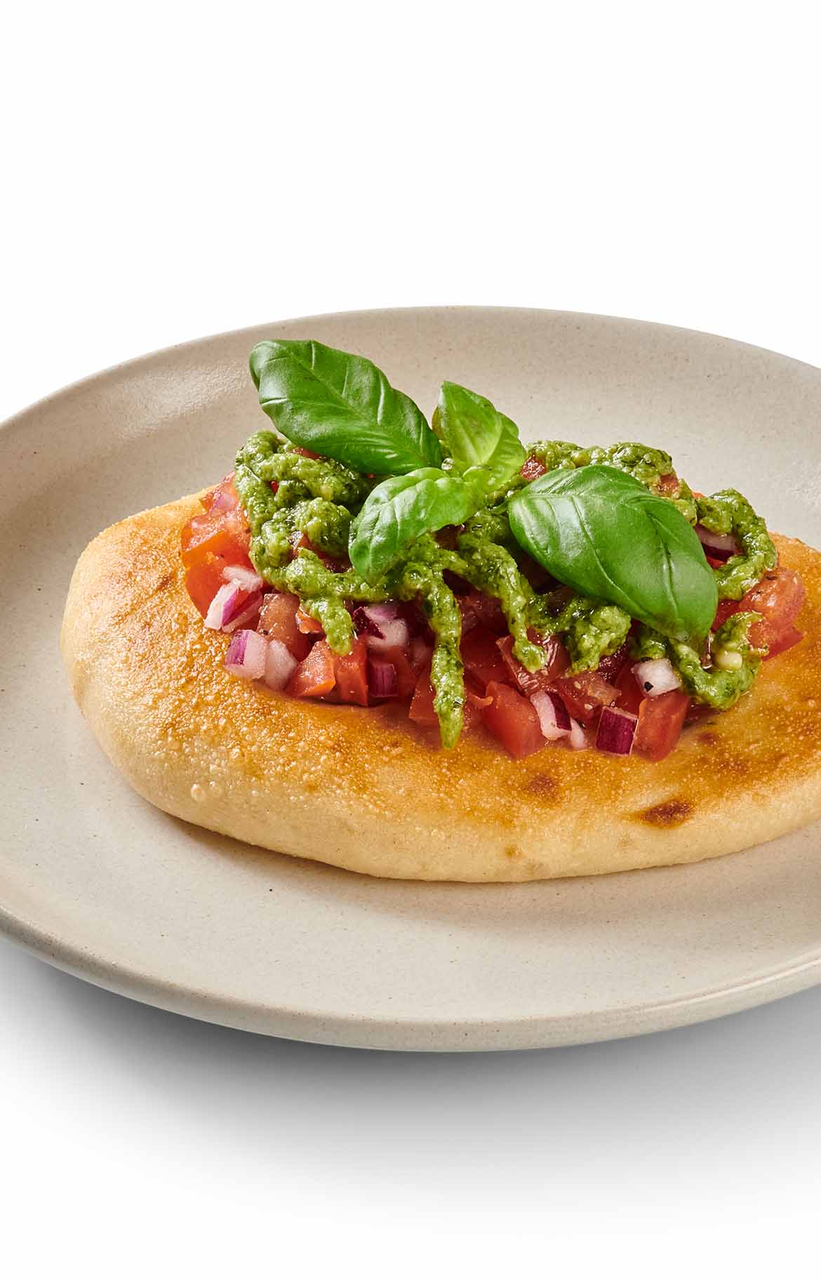 Freshly-baked dough topped with our signature garlic butter, fresh tomatoes, red onion and basil & pine kernel pesto