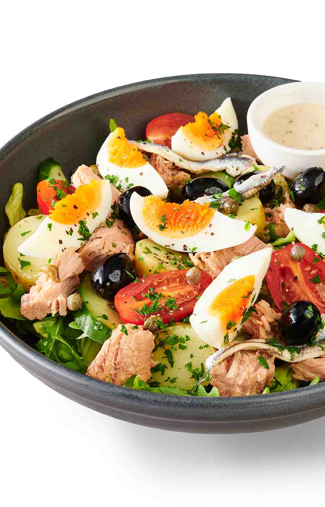 On the menu since '85. The big flavours of tuna, white anchovies, capers and olives with new potatoes, Cos lettuce, rocket, cucumber, tomato, free-range egg, parsley and house dressing