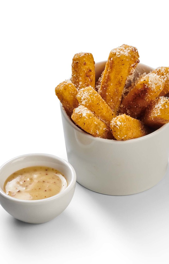 Rosemary polenta chips with Gran Milano cheese and honey & mustard dip