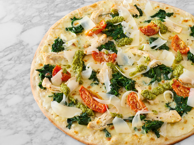 Chicken, spinach, mozzarella and garlic oil on a bechamel base, topped with slow-roasted tomatoes, basil & pine kernel pesto and Gran Milano cheese