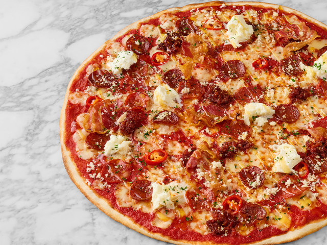 A fiery meat lover's feast. 'Nduja and Calabrese sausage, plus pepperoni and crispy pancetta. With two types of mozzarella, Gran Milano cheese, chilli, parsley and hot honey