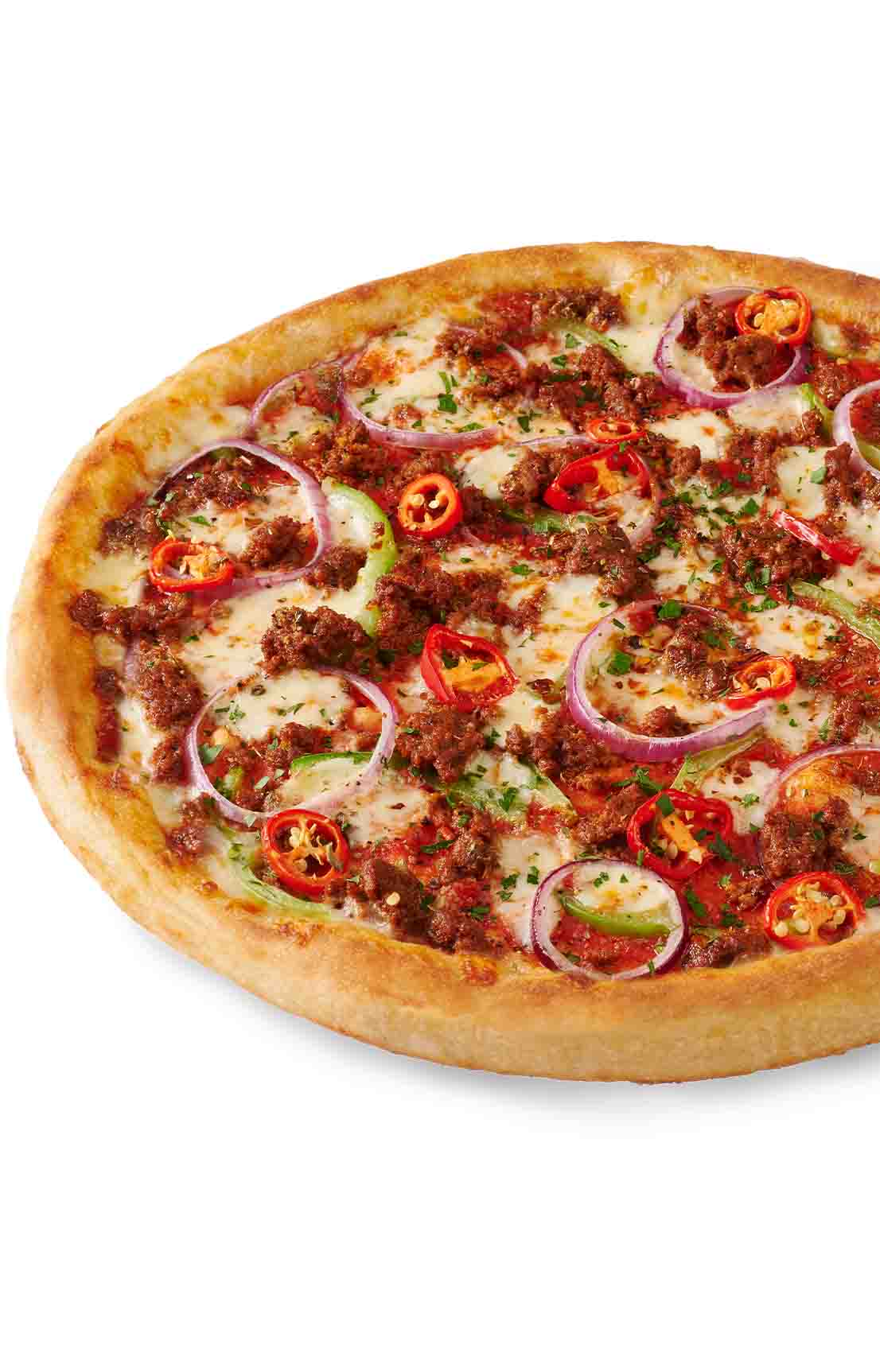 A hot, modern take on a much-loved favourite. Tender, spiced ground beef, fresh chillies, red onion, green pepper, tomato and mozzarella, finished with chilli oil and parsley